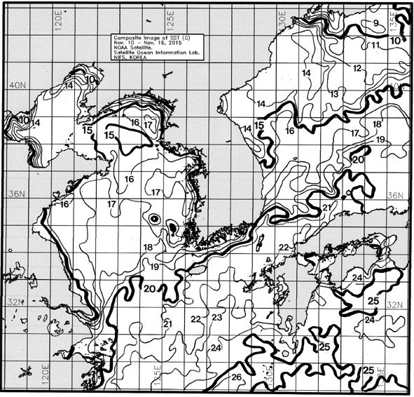 ◦ 금주(2015.11.22~2015.11.28)의 한국근해 표면수온은 대화퇴 근해 섭씨 14~15도, 울릉도-독도 근해 16~18도, 대마도 근해 20~21도, 제주도 근해 19~20도, 이어도 근해 18~20도, 가거초 근해 15~17도, 어청도 근해 14~15도, 백령도 근해 12∼14도 내외로 예상됩니다. ◦ 수온 전선대는 제주해협-대한해협 근해에 걸쳐 수온 18도를 중심으로 형성될 것으로 예상됩니다. 광역 위성영상 합성 표면수온 분포도 (2015. 11. 10 ~ 2015. 11. 16)