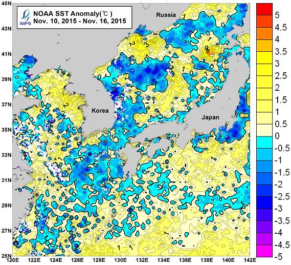 ◦「평년에 비해」 대화퇴 근해 0.5도 높게, 울릉도-독도 근해 0.5도 높게, 대마도 근해 0.5도 높게, 제주도 근해 비슷하게, 이어도 근해 0.5도 높게, 가거초 근해 2.5도 높게, 어청도 근해 3도 높게 나타날 것으로 예상됩니다. NOAA 위성영상 표면수온 평년편차 분포도 (2015. 11. 10 ~ 2015. 11. 16)