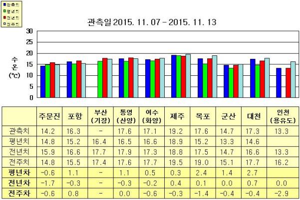 ◦ 금주(2015.11.22~2015.11.28)의 한반도 연안 표면수온은 동해 연안역에서 섭씨 13~15도, 남해 연안역에서 14.5~18.0도, 서해 연안역에서 11.5~15.0도 내외로 예상됩니다. ◦ 평년에 비해 포항 0.6도 높음을 제외한 동해 연안역은 비슷하게, 남해 연안역은 0.5~1.0도 높게, 서해 연안역은 2~3도 높게 나타날 것으로 예상됩니다. ◦전년에 비해 동해 연안역은 0.5~1.5도 낮게, 제주 0.4도 높음을 제외한 남해 연안역은 비슷하게, 인천, 대천 비슷함을 제외한 서해 연안역은 1도 높게 나타날 것으로 예상됩니다. |