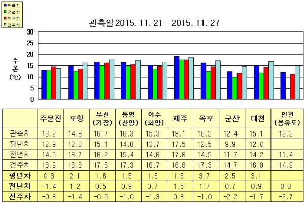 ◦ 금주(2015.12.06~2015.12.12)의 한국근해 표면수온은 대화퇴 근해 섭씨 12~13도, 울릉도-독도 근해 14~15도, 대마도 근해 18~19도, 제주도 근해 17~18도, 이어도 근해 15~17도, 가거초 근해 13~14도, 어청도 근해 11~12도, 백령도 근해 11∼12도 내외로 예상됩니다. ◦ 수온 전선대는 제주해협-대한해협 근해에 걸쳐 수온 18도를 중심으로 형성될 것으로 예상됩니다. 광역 위성영상 합성 표면수온 분포도 (2015. 11. 24 ~ 2015. 11. 30) ◦「평년에 비해」 대화퇴 근해 1도 높게, 울릉도-독도 근해 1.5도 낮게, 대마도 근해 1도 낮게, 제주도 근해 1도 낮게, 이어도 근해 1도 낮게, 가거초 근해 0.5도 낮게, 어청도 근해 비슷하게 나타날 것으로 예상됩니다. NOAA 위성영상 표면수온 평년편차 분포도 (2015. 11. 24 ~ 2015. 11. 30) ※ 위 그림은 NOAA 위성에서 관측한 한반도 주변해역 표면수온 영상의 평년(1990-2014년) 에 대한 편차 분포를 나타냅니다.