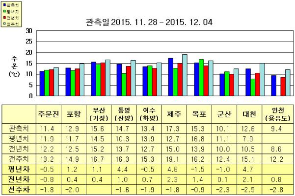 Ⅰ. 위성관측 한국 근해 표면수온 정보 ◦ ◦ 수온 전선대는 제주해협-대한해협 근해에 걸쳐 수온 17도를 중심으로 형성될 것으로 예상됩니다. 광역 위성영상 합성 표면수온 분포도 (2015. 12. 01 ~ 2015. 12. 07) ◦「평년에 비해」 대화퇴 근해 1도 높게, 울릉도-독도 근해 1도 낮게, 대마도 근해 비슷하게, 제주도 근해 0.5도 높게, 이어도 근해 0.5도 높게, 가거초 근해 1.5도 높게, 어청도 근해 1.5도 높게 나타날 것으로 예상됩니다. NOAA 위성영상 표면수온 평년편차 분포도 (2015. 12. 01 ~ 2015. 12. 07)