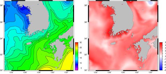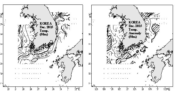 우리나라 연근해 수심 50m층의 수평수온분포는 동해는 13~16℃ 범위를 나타냈으며 평년에 비하여 관측해역의 일부해역을 제외한 대부분의 해역에서 1~2℃ 범위의 고온현상을 나타내었다. 남해는 14~19°C 범위를 나타냈으며, 평년에 비하여 대부분의 관측 해역에서 1℃ 내외의 고온현상을 나타내었다. 서해는 9~14°C 범위를 나타냈으며, 평년에 비하여 대부분의 관측해역에서 1~2°C 범위의 고온현상을 나타내었다 (그림 2). 그림 3. 2015년 12월 수심 50m층의 수온수평분포도 및 평년편차도 (빗금영역은 평년보다 낮은 수온 해역)