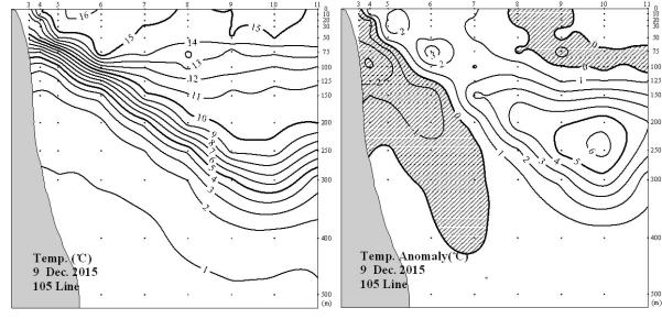 동해 동방의 연직수온분포도(그림 3)에 의하면, 8℃를 중심으로 수온약층이 형성되었으며, 연안에서 외해로 갈수록 수온약층 형성수심이 깊어지고 있으며, 평년에 비하여 정점 3~7사이 표층~수심 400m와 정점 8~11사이 표층~수심 100m에서 1~2℃ 범위의 저온현상을 보였고, 그 이외의 대부분의 관측해역에서 1~6℃ 범위의 고온현상을 보였습니다. 그림 4. 2015년 12월 105선 연직수온(A) 및 평년편차도(B)(빗금영역은 평년보다 낮은 수온 해역)