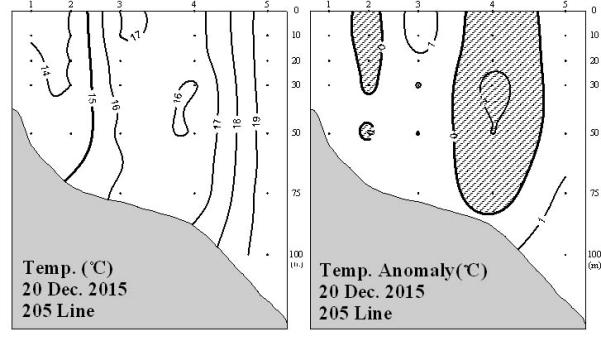 나. 남해 소리도 남동쪽 약 50마일까지의 연직수온분포도(그림 4)에 의하면, 연직적으로 거의 균일한 양상을 보였으며, 연안역에서 외해역으로 갈수록 수온이 상승하는 경향을 나타내었다. 평년에 비하여 정점 3~5 사이에서 1℃ 내외의 저온현상을 보였으며, 이를 제외한 관측해역에서 1℃ 내외의 고온현상을 보였습니다. 그림 5. 2015년 12월 205선 연직수온(A) 및 평년편차도(B)(빗금영역은 평년보다 낮은 수온 해역)