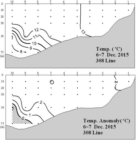 3. 해역별 해황특징 12월에 각 해역별 수산연구소에서 조사한 수심 50m층의 수온수평분포도와 평년편차도, 해역별 대표 정선인 105선(동해, 동해 동방), 205선(남해, 소리도 남동), 308선(서해, 태안반도 남서방)의 연직수온분포도 및 평년편차도를 그림 3, 4, 5, 6에 나타내었다.