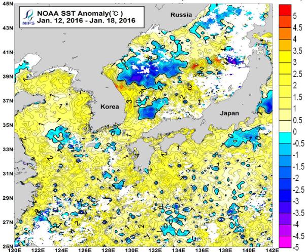 광역 위성영상 합성 표면수온 분포도 (2016. 01. 12 ~ 2016. 01. 18) ◦「평년에 비해」 대화퇴 근해 1도 높게, 울릉도-독도 근해 0.5도 높게, 대마도 근해 비슷하게, 제주도 근해 0.5도 낮게, 이어도 근해 0.5도 낮게, 가거초 근해 비슷하게, 어청도 근해 1도 높게 나타날 것으로 예상됩니다. NOAA 위성영상 표면수온 평년편차 분포도 (2016. 01. 12 ~ 2016. 01. 18)
