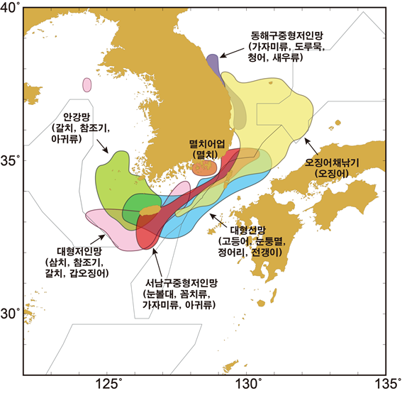 1. 어종별 어황 1월의 주요 어종별 어황을 살펴보면 갈치, 망치고등어는 평년비 순조로웠으나, 멸치, 살오징어, 전갱이, 참다랑어, 참조기는 평년수준이었으며, 고등어는 평년비 부진하였다. 2월에 들면 고등어는 월동을 위해 남하하는 어군을 대상으로 제주도 주변해역에서 중심어장이 형성되겠으며, 동해남부와 남해동부해역에서도 일부 어장이 형성될 것으로 전망된다. 하순으로 갈수록 제주도 남동부해역으로의 내유량이 증가하겠으며, 전체적인 어황은 평년비 소폭 부진 또는 평년수준을 나타낼 것으로 전망된다. 전갱이는 제주도 주변해역과 대마도 동북부해역에서 어장이 형성되겠으며, 전체적인 어황은 내유자원량의 증가로 평년수준을 나타낼 것으로 예측된다. 살오징어는 월동을 위해 남하회유하는 잔류군을 대상으로 동해남부 및 남해동부해역에서 중심어장이 형성되겠으나, 하반기로 갈수록 어군 밀도는 감소할 것으로 전망된다. 전체적인 어황은 채낚기어업과 쌍끌이대형저인망에서의 어획증가로 평년 수준을 유지할 것으로 전망된다. 멸치는 월동을 위해 남하하는 어군을 대상으로 남해도~거제도 주변해역에서어장이 형성되겠으며, 계절적인 수온 하강에 따라 동해남부해역에서도 어장이 형성될 것으로 예상된다. 전체적인 어황은 수온전선대를 따라 멸치 어군이 밀집하면서 평년수준 또는 평년비 순조로울 것으로 전망된다. 갈치는 제주도 주변해역을 중심으로 남해 전 해역에 걸쳐 어장이 형성되겠으며, 대형트롤, 안강망어업 및 대형선망어업에 의한 어획량이 높아 전체적인 어황은 평년비 순조로울 것으로 전망된다. 하지만 전체 어획물 중 미성어의 어획비율이 높아 소형개체를 대상으로 한 어획자제가 요구된다. 참조기는 계절적인 수온하강에 따라 남하하는 어군에 의해 제주도 서부해역과 남해중서부해역에서 중심어장이 형성되겠으며, 전체적인 어황은 대형트롤 및 저인망어업에서의 어획량 증가로 평년수준을 나타낼 것으로 예상된다. 그 외, 말쥐치는 동해남부해역에서 어장이 일부 형성되었으나, 여전히 자원량이 회복되지 않고 있으며, 명태, 갑오징어도 낮은 자원수준을 유지하고 있다. 2015년 12월 중순~2016년 1월 중순까지 고등어의 어장분포 (대형선망)2015년 12월 중순~2016년 1월 중순까지 살오징어의 어장분포 (전체어업)2. 업종별 어황 ○ 2월 어업별 예상어장도 ○ 대형선망어업 1월의 대형선망어업은 93, 94해구를 중심으로 한 동해남부와 제주도 주변해역에서 고등어(49%), 눈퉁멸(23%), 정어리(9%), 전갱이(5%), 살오징어(4%) 등을 대상으로 조업하였다. 고등어는 전해역에서 어획된 반면, 눈퉁멸은 93, 101해구에서 주로 어획되었으며, 갈치, 삼치 등은 제주도 주변해역에서 어획되었다. 전체적인 어획량과 척당어획량은 평년수준을 유지하였다. 2월에 들면 대형선망어업은 월동을 위해 남하하는 어군을 대상으로 제주도 주변해역에서 고등어, 눈퉁멸, 정어리, 삼치 등을 대상으로 중심어장이 형성되겠으며, 동해남부해역에서도 부분적인 어장이 형성될 것으로 전망된다. 대형선망어업의 전체적인 어황은 평년수준을 유지할 것으로 예상된다. ※ 일본 EEZ수역 어황전망 일본 EEZ 수역인 대마도 동북부해역과 큐슈 서부해역에서도 월동을 위해 남하한 고등어, 살오징어, 눈퉁멸 등을 대상으로 부분적인 어장이 형성될 것으로 예상된다. ○ 멸치어업 1월의 멸치어업은 권현망어업에 의해 남해동부해역의 남해도와 거제도를 중심으로 주 어장이 형성되었으며, 전체적인 어획량과 척당어획량은 평년수준을 나타내었다. 한편 자망어업에 의해 동해남부해역에서도 부분적인 조업이 이루어졌다. 2월에 들면 권현망어업은 연안수온의 하강으로 외해로 월동 회유하는 어군을 대상으로 남해 중동부해역에서 어장이 형성되겠으나 하순으로 갈수록 어군 밀도는 점차 낮아질 것으로 전망된다. 또한 동해남부해역에서는 자망어업에 의해 울산~기장 주변해역에서 부분적인 어장이 형성될 것으로 전망된다. 전체적인 어황은 평년수준을 유지할 것으로 전망된다. ○ 근해안강망어업 1월의 근해안강망어업은 제주도 북부해역에서 갈치(37%), 참조기(32%), 아귀류(12%), 병어(4%) 등을 중심으로 어장이 형성되었으며, 전체적인 어황은 평년수준을 나타내었다. 서해 중부해역에서도 부분적인 어장이 형성되었는데, 주로 참조기와 갈치를 어획하였다. 2월에 들면 근해안강망어업은 서해남부해역과 제주도 북부해역 사이에서 갈치, 아귀류, 참조기 등을 대상으로 어장이 형성될 것으로 전망된다. 전체적인 어황은 제주도 주변해역으로의 내유량이 증가하여 평년수준을 유지할 것으로 예상된다. ○ 저인망어업 1월의 대형저인망어업은 쌍끌이어업이 서해 특정해역과 남해 전해역에서 삼치, 갈치, 참조기, 오징어, 풀반지 등을 어획하였으며, 외끌이어업이 제주도 주변해역에서 갑오징어류, 참조기, 참돔, 매퉁이, 보구치 등을 어획하였다. 서남구중형저인망어업은 동해남부해역에서 눈볼대, 가자미류, 꼼치류, 아귀류, 황돔 등을 어획하였으며, 제주도 남서부해역에서는 민어, 참조기, 물가자미 등을 어획하였다. 저인망