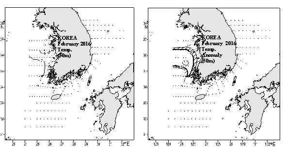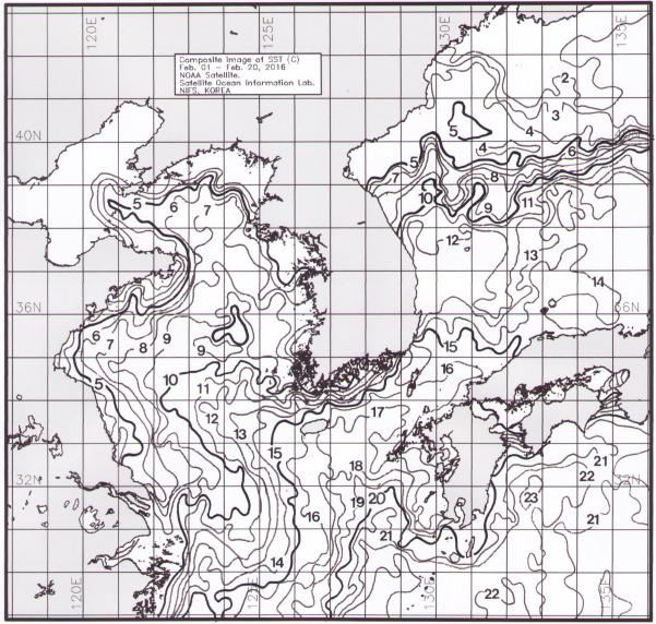 우리나라 2월 연안 수온은 월평균 1.5~13.4℃ 범위의 분포를 보였다. 동해연안의 주문진의 월평균 수온은 7.3℃로 평년에 비해 0.9°C 고온 분포를 보였고, 포항의 월평균 수온은 8.0℃로 평년과 비슷한 분포를 보였다. 남해연안의 부산, 제주의 월평균 수온은 11.6~13.4℃로 평년과 비슷한 분포를 보였고, 통영, 여수의 월평균 수온은 6.4~8.9℃로 평년에 비해 0.1~0.4℃의 저온 분포를 보였다. 서해연안의 목포, 군산의 월평균 수온은 3.9~6.1℃로 평년에 비해 1.0~1.5°C의 고온 분포를 보였고, 인천의 월평균 수온은 1.5℃로 평년에 비해 0.4°C 저온 분포를 보였다. 인공위성 관측 자료로 2016년 2월 1일부터 20일까지 합성한 우리나라 주변해역 표면수온분포도를 보면(그림 1), 동해 근해역은 11~14℃로 평년과 비슷한 분포를 보였으며, 대화퇴 근해는 5~9°C, 울릉도 근해는 12~13°C의 분포를 보였다. 서해 근해역은 5~8℃로 평년에 비해 1°C 내외의 낮은 분포를 보였으며, 어청도 근해는 7~8°C를 보였다. 남해 근해역은 8~17℃로 평년에 비하여 1~2°C 범위의 높은 수온분포를 보였으며, 대마도 근해는 15~17°C, 제주도 근해는 5~17°C 분포를 보였다. 2. 3월의 해황 전망