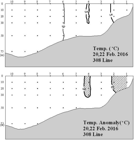 3. 해역별 해황특징 2월에 각 해역별 수산연구소에서 조사한 수심 50m층의 수온수평분포도와 평년편차도, 해역별 대표 정선인 308선(서해, 대천서방)의 연직수온분포도 및 평년편차도를 그림 2, 3에 나타내었다(동해, 남해는 기상악화로 인해 현재 관측이 완료되지 않았음). 그림 2. 2016년 2월 수심 50m층의 수온수평분포도 및 평년편차도(빗금영역은 평년보다 낮은 수온 해역) 우리나라 연근해 수심 50m층의 수평수온분포는 서해의 경우 5~8°C의 범위로 분포하였고, 평년에 비해 일부해역을 제외한 대부분의 관측해역에서 1℃ 내외의 고온현상을 보였다 (그림 2). 가. 서해 대천서방의 연직수온분포도(그림 3)에 의하면, 계절적인 영향으로 인한 표·저층 연직혼합으로 수온약층은 나타나지 않았으며, 외해역으로 갈수록 높은 수온분포를 보였다. 평년에 비하여 정점 1∼2사이와 정점 4부근에서 1℃ 내외의 저온현상을 보였으며, 이를 제외한 대부분의 해역에서 1℃ 내외의 고온현상을 보였다. (빗금영역은 평년보다 낮은 수온 해역) =$row['content']?> =$row['content']?> =$row['content']?> |