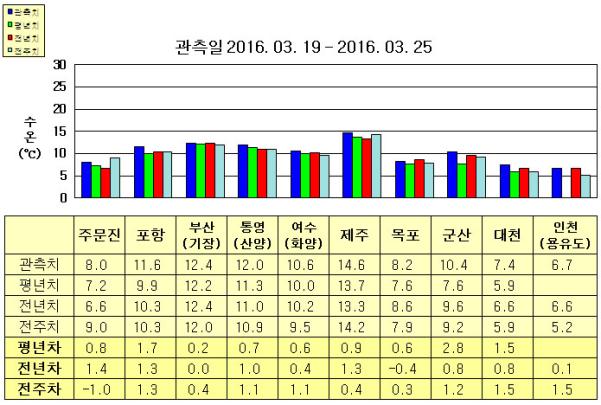 ◦ 금주(2016.03.27~2016.04.02)의 한반도 연안 표면수온은 동해 연안역에서 섭씨 8~13도, 남해 연안역에서 11~14.5도, 서해 연안역에서 7~11도 내외로 예상됩니다.