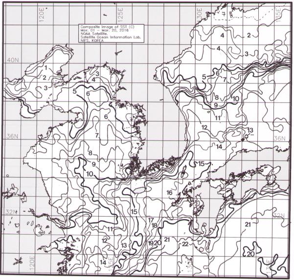 연안수온은 월평균 5.5~14.1°C 범위의 분포를 보였다. 동해연안의 주문진, 포항의 월평균 수온은 7.9~9.6℃로서, 평년에 비해 0.4~1.2°C의 고온현상을 보였다. 남해연안의 부산, 여수, 제주의 월평균 수온은 8.8~14.1°C로서 평년에 비해 0.1~0.4°C 정도의 고온현상을 보였고, 통영의 월평균 수온은 10.1°C로서 평년에 비해 0.5°C 정도의 저온현상을 보였다. 서해연안의 목포, 군산, 인천의 월평균 수온은 5.5°C~7.5°C로서 평년에 비해 1.1~2.0°C의 고온현상을 보였다. 인공위성 관측 자료로 2016년 3월 1일부터 20일까지 합성한 우리나라 주변해역 표면수온분포도를 보면(그림 1), 동해 연근해역은 10~14°C로 평년에 비해 1~3°C 범위의 높은 수온분포를 보였으며, 대화퇴 근해는 11~12°C, 울릉도 연근해는 11~12°C의 분포를 보였다. 서해 연근해역은 5~10°C로 평년에 비해 1°C 내외의 높은 수온분포를 보였으며, 어청도 연근해는 6~7°C의 분포를 보였다. 남해 연근해역은 11~17°C로 평년에 비해 1~2°C 범위의 높은 수온분포를 보였으며, 대마도 연근해는 15~16°C, 제주도 연근해는 14~16°C의 분포를 보였다.