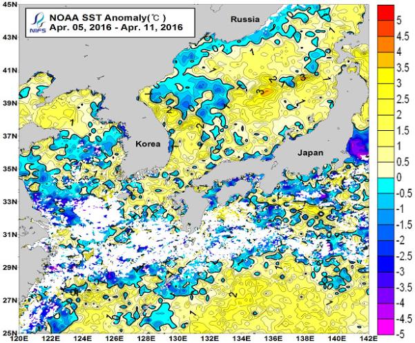광역 위성영상 합성 표면수온 분포도 (2016. 04. 05 ~ 2016. 04. 11) ◦「평년에 비해」 대화퇴 근해 2도 높게, 울릉도-독도 근해 1도 높게, 대마도 근해 0.5도 높게, 제주도 근해 비슷하게, 이어도 근해 0.5도 낮게, 가거초 근해 0.5도 낮게, 어청도 근해 0.5도 높게 나타날 것으로 예상됩니다. NOAA 위성영상 표면수온 평년편차 분포도 (2016. 04. 05 ~ 2016. 04. 11) ※ 위 그림은 NOAA 위성에서 관측한 한반도 주변해역 표면수온 영상의 평년(1990-2015년) 에 대한 편차 분포를 나타냅니다.