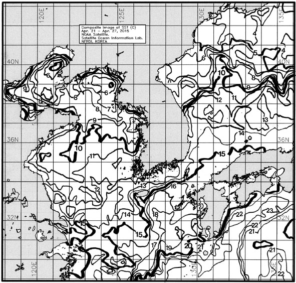 ◦「작년에 비해」 대화퇴 근해 2도 높게, 울릉도-독도 근해 0.5도 낮게, 대마도 근해 1도 낮게, 제주도 근해 0.5도 낮게, 이어도 근해 1도 낮게, 가거초 1도 낮게, 어청도 근해 0.5도 높게, 백령도 0.5도 높게 나타날 것으로 예상됩니다. 광역 위성영상 합성 표면수온 분포도 (2015. 04. 21 ~ 2015. 04. 27)