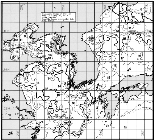 ◦ 금주(2016.05.29~2016.06.04)의 한국근해 표면수온은 대화퇴 근해 섭씨 16~18도, 울릉도-독도 근해 20~21도, 대마도 근해 20~22도, 제주도 근해 19~20도, 이어도 근해 18~19도, 가거초 근해 18~20도, 어청도 근해 18~19도, 백령도 근해 12∼13도 내외로 예상됩니다. ◦ 수온 전선대는 대화퇴 근해에 걸쳐 수온 13도를 중심으로 형성, 제주해협-대한해협 근해에 걸쳐 수온 18도를 중심으로 형성 될 것으로 예상됩니다.
