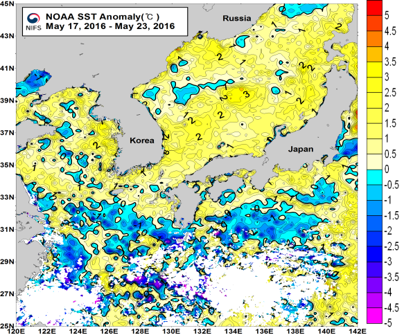 NOAA 위성영상 표면수온 평년편차 분포도 (2016. 05. 17 ~ 2016. 05. 23) ※ 위 그림은 NOAA 위성에서 관측한 한반도 주변해역 표면수온 영상의 평년(1990-2015년) 에 대한 편차 분포를 나타냅니다.