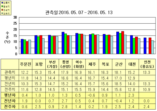 ◦ 금주(2016.05.29~2016.06.04)의 한반도 연안 표면수온은 동해 연안역에서 섭씨 15.0~17.5도, 남해 연안역에서 18.0~19.5도, 서해 연안역에서 18~22도 내외로 예상됩니다.