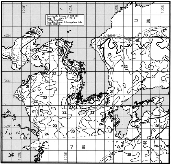 광역 위성영상 합성 표면수온 분포도 (2016. 06. 21 ~ 2016. 06. 27)