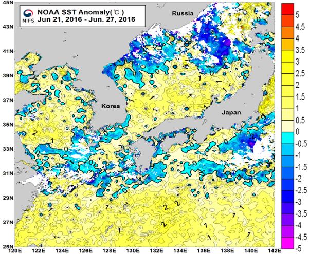 NOAA 위성영상 표면수온 평년편차 분포도 (2016. 06. 21 ~ 2016. 06. 27)