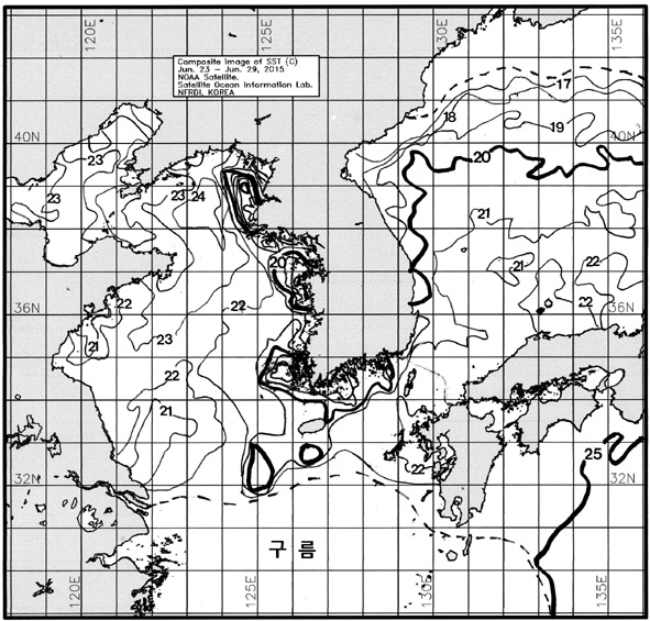 ※ 위 그림은 NOAA 위성에서 관측한 한반도 주변해역 표면수온 영상의 평년(1990-2015년) 에 대한 편차 분포를 나타냅니다. ◦「작년에 비해」 대화퇴 근해 1.5도 낮게, 울릉도-독도 근해 0.5도 높게, 대마도 근해 비슷하게, 제주도 근해 비슷하게, 이어도 근해 2도 높게, 가거초 1도 낮게, 어청도 근해 1도 낮게, 백령도 0.5도 낮게 나타날 것으로 예상됩니다. 광역 위성영상 합성 표면수온 분포도 (2015. 06. 23 ~ 2015. 06. 29)