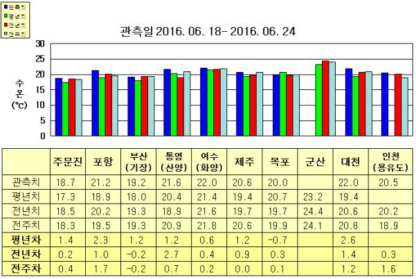 ◦ 금주(2016.07.03~2016.07.09)의 한반도 연안 표면수온은 동해 연안역에서 섭씨 19.0~21.5도, 남해 연안역에서 21.0~22.5도, 서해 연안역에서 20.5~24.5도 내외로 예상됩니다. ◦ 평년에 비해 주문진 비슷함을 제외한 동해 연안역은 1~2도 높게, 통영(산양) 0.4도 높음을 제외한 남해 연안역은 비슷하게, 대천 0.7도 높음을 제외한 서해 연안역은 비슷하게 나타날 것으로 예상됩니다. ◦전년에 비해 주문진 0.5도 높음을 제외한 동해 연안역은 비슷하게, 남해 연안역은 0.5~2.0도 높게, 인천(용유도) 1.3도 낮게, 대천 비슷함을 제외한 서해 연안역은 0.5~1.0도 높게 나타날 것으로 예상됩니다. =$row['content']?> =$row['content']?> =$row['content']?> |