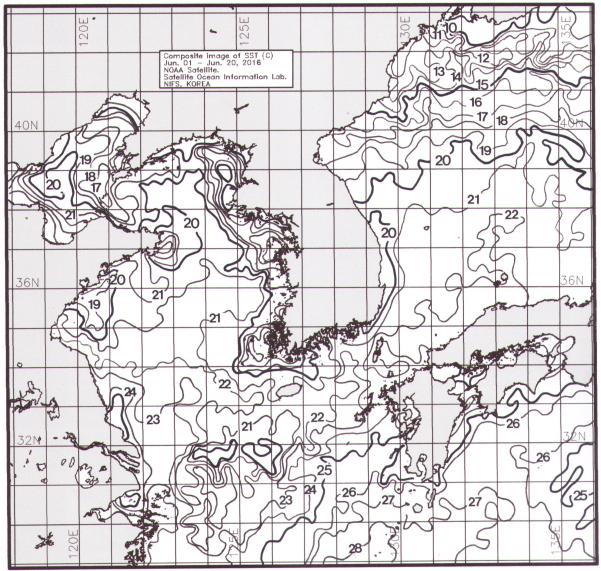 그림 1. 2016년 6월 1~20일까지 합성한 위성관측 표면수온분포도.