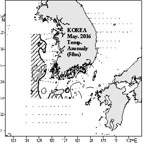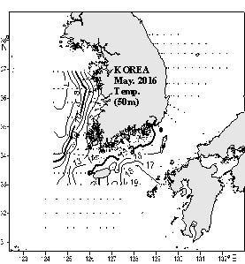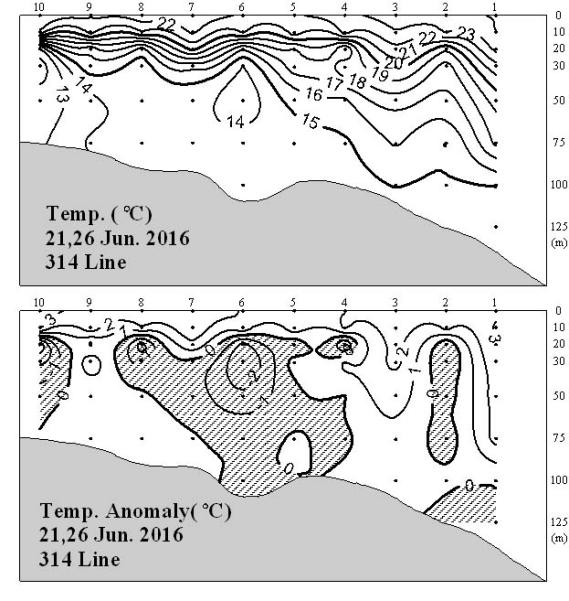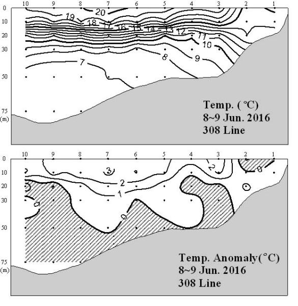 3. 해역별 해황특징 6월에 각 해역별 수산연구소에서 조사한 수심 50m층의 수온수평분포도와 평년편차도, 해역별 대표 정선인 308선(서해, 대천 서방), 314선(남해, 제주 남부해역)의 연직수온분포도 및 평년편차도를 그림 2, 3, 4, 5에 나타내었다 (동해는 현재 자료 검토중임). 그림 2. 2016년 6월 수심 50m층의 수온 수평 분포도그림 3. 2016년 6월 수심 50m층의 수온 수평 평년편차도(빗금영역은 평년보다 낮은 수온해역) 우리나라 연근해 수심 50m층의 수평수온분포는, 서해의 경우 7~14℃ 범위로 분포하였고, 남해는 13~18°C 범위로 분포하였다. 평년에 비해 조사해역 서쪽 근해역에서 1℃ 내외의 저온현상을 보였고, 이를 제외한 대부분의 조사해역에서 1~2℃ 범위의 고온현상을 보였다(그림 2, 3). 가. 서해 대천 서방의 연직수온분포도(그림 4)에 의하면, 수심 10~50m에서 13℃를 중심으로 수온약층이 형성되었고, 6∼20℃의 수온분포를 보였다. 평년에 비해 정점 2∼10사이 수심 20m이하에서 1℃ 내외의 저온현상을 보였고, 이를 제외한 조사해역에서 1~3℃ 범위의 고온현상을 보였다.