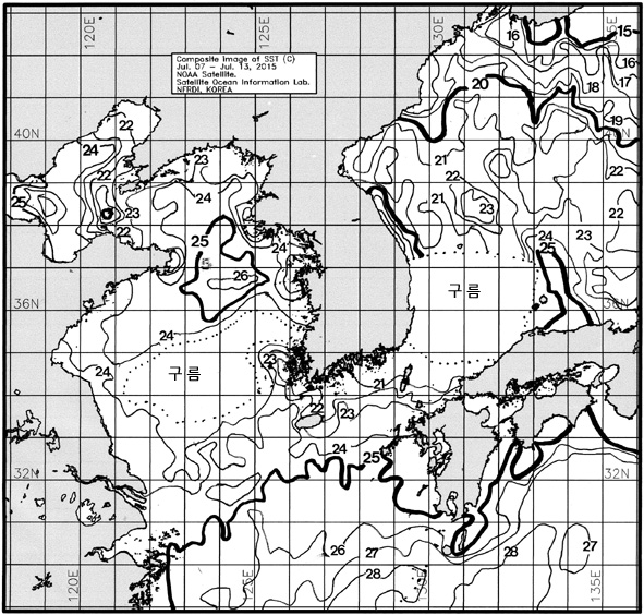 ※ 위 그림은 NOAA 위성에서 관측한 한반도 주변해역 표면수온 영상의 평년(1990-2015년) 에 대한 편차 분포를 나타냅니다. ◦「작년에 비해」 대화퇴 근해 2도 낮게, 울릉도-독도 근해 비슷하게, 대마도 근해 0.5도 높게, 제주도 근해 1도 높게, 이어도 근해 2도 높게, 가거초 비슷하게, 어청도 근해 0.5도 낮게, 백령도 2도 낮게 나타날 것으로 예상됩니다. 광역 위성영상 합성 표면수온 분포도 (2015. 07. 07 ~ 2015. 07. 13)