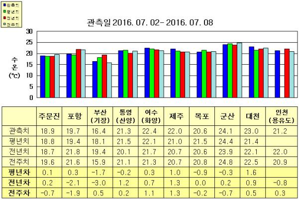 II. 한국 연안 수온정보 ◦ 금주(2016.07.17~2016.07.23)의 한반도 연안 표면수온은 동해 연안역에서 섭씨 18.5~20.5도, 남해 연안역에서 23~24도, 서해 연안역에서 22.5~26.0도 내외로 예상됩니다. ◦ 평년에 비해 주문진 비슷함을 제외한 동해 연안역은 0.5~1.5도 낮게, 제주 0.4도 높음을 제외한 남해 연안역은 비슷하게, 목포 1도 낮음을 제외한 서해 연안역은 비슷하게 나타날 것으로 예상됩니다. ◦전년에 비해 부산(기장) 3.5도 낮음을 제외한 동해 연안역은 비슷하게, 남해 연안역은 0.5~3.0도 높게, 군산 비슷함, 인천(용유도) 1도 낮음을 제외한 서해 연안역은 0.5~1.0도 높게 나타날 것으로 예상됩니다. |