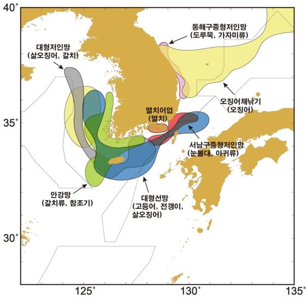 1. 어종별 어황 7월의 주요 어종별 어황을 살펴보면 멸치, 갈치, 살오징어는 평년수준이었으나 고등어, 전갱이, 참조기는 평년비 부진하였다. 8월에 들면 고등어는 동중국해와 제주 주변해역에서 산란(4~6월)을 마친 어군이 난류세력을 따라 북상회유하여 대마난류 세력의 영향을 받는 제주도 주변해역 및 서해 중남부해역(고등어)에서 중심어장이 형성될 것으로 예상된다. 척당어획량이 평년에 비해 낮은 수준으로 전체적인 어황은 평년수준 또는 다소 부진할 것으로 예상된다. 전갱이는 제주도 주변해역 및 대마도 북동해역에서 어장이 형성되겠으며, 상대적으로 제주도 주변해역에서 어군 밀도가 높을 것으로 예상된다. 전체적인 어황은 평년수준이거나 부진할 것으로 전망된다. 살오징어는 서해 전해역과 동중국해, 동해 중부해역 및 대화퇴를 중심으로 어장이 형성되어, 본격적인 여름철 어기가 시작되겠다. 전체적인 어황은 평년비 순조로울 것으로 예상된다. 멸치는 기선권현망어업에서 남해도와 거제도 주변해역을 중심으로 남해연안으로 가입된 어군을 대상으로 조업이 이루어지겠다. 전체적인 어황은 평년비 순조 또는 평년수준으로 전망된다. 갈치는 서해 남부해역에서부터 제주도를 포함한 북부 동중국해까지 어장이 형성되며 중심어장은 서해 남부 근해와 제주주변해역에서 형성될 것으로 전망된다. 연중 어획량이 가장 많은 주 어획시기에 접어들겠으며, 전체적인 어황은 평년수준 또는 평년비 순조로울 것으로 예상된다. 하지만 전체 어획물 중 미성어의 어획비율이 여전히 높아 소형개체를 대상으로 한 어획자제가 요구된다. 참조기는 올해 신설된 7월 한 달간의 금어기를 끝내고 정상적인 조업을 재개하겠다. 서해남부해역과 제주도 남부해역에서 어장이 형성될 것으로 전망되나, 주 어획시기가 시작되는 9월 이전에는 어획량이 많지 않겠고, 전체적인 어황은 평년수준으로 예상된다. 그 외, 망치고등어는 제주남부해역을 중심어장으로 순조로운 어황을 보일 것으로 기대된다. 꽁치는 어기가 끝나고 한산해질 전망되며, 말쥐치는 금어기(5~7월)가 끝나고 조업이 재개되겠다. 2. 업종별 어황 8월 어업별 예상어장도○ 대형선망어업 7월의 대형선망어업은 남해동부와 동해남부 해역(대마도 주변해역)에서 고등어(46.8%), 전갱이(15.2%), 망치고등어(13.8%), 눈퉁멸(8.8%) 등을 대상으로 조업하였다. 전년에 비해 주요어획종의 비율(15‘ 전갱이 64.7%, 고등어 23.1%)에서 큰 차이를 보였다. 8월에 들면 대형선망어업은 전갱이, 고등어, 살오징어 등을 대상으로 대마난류의 흐름을 따라 제주 주변해역에서 동해남부(대한해협 근해)에 걸쳐 형성되는 어장과 서해 중남부 어장에서 조업이 이루어지겠다. 전체적인 어황은 평년수준 또는 다소 부진할 것으로 예상된다. ○ 멸치어업 7월의 멸치어업은 금어기(4~6월)를 끝낸 기선권현망어업이 남해도와 거제도 주변해역에서 조업하였으며, 전체적인 어획량은 평년수준을 나타내었다. 8월에 들면 기선권현망어업이 남해도와 거제도 주변해역을 중심으로 조업을 이어나가겠으며, 전체적인 어황은 평년비 순조 또는 평년수준으로 전망된다.