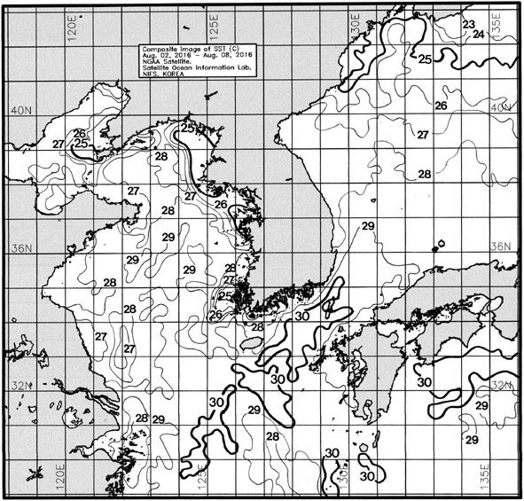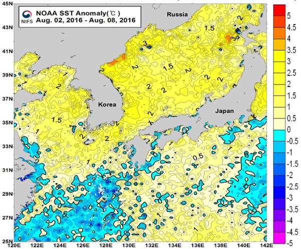 광역 위성영상 합성 표면수온 분포도 (2016. 08. 02 ~ 2016. 08. 08) ◦「평년에 비해」 대화퇴 근해 2도 높게, 울릉도-독도 근해 2도 높게, 대마도 근해 2도 높게, 제주도 근해 1.5도 높게, 이어도 근해 1도 높게, 가거초 근해 1.5도 높게, 어청도 근해 1.5도 높게 나타날 것으로 예상됩니다. NOAA 위성영상 표면수온 평년편차 분포도 (2016. 08. 02 ~ 2016. 08. 08)