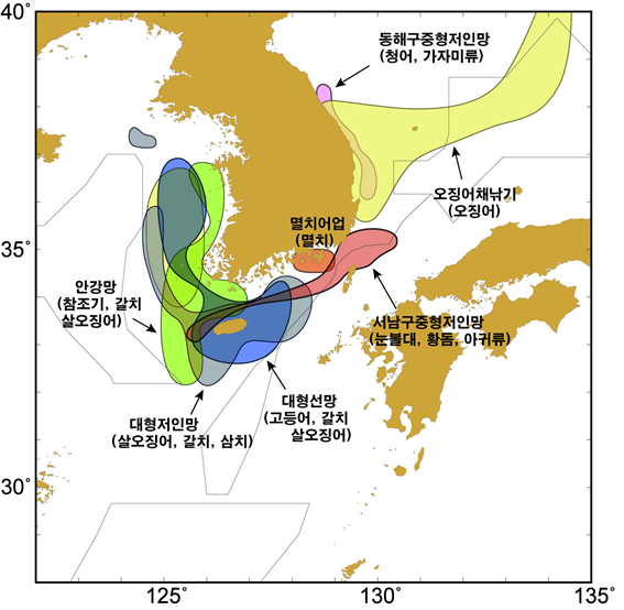1. 어종별 어황 8월의 주요 어종별 어황을 살펴보면 멸치, 살오징어는 증가하였고, 고등어는 평년수준이었으며, 갈치, 전갱이, 참조기는 평년비 부진하였다. 9월에 들면 고등어는 계절적인 수온상승에 따라 북상회유하여, 대마난류 세력의 영향을 받는 제주도 주변해역 및 서해 중남부해역에서 중심어장이 형성될 것으로 예상된다. 전체적인 어황은 평년수준일 것으로 전망된다. 전갱이는 제주도 주변해역에서 어장이 형성되며, 제주 남부 근해에서 중심어장이 형성될 것으로 예상된다. 전체적인 어황은 평년비 부진할 것으로 전망된다. 살오징어는 동해 중부해역~대화퇴 및 러시아의 블라디보스톡 근해까지 폭넓게 어장이 형성되겠으며, 제주 서부해역을 따라 흐르는 난류를 타고 서해로 유입된 어군에 의해 서해 중남부해역에서도 조업이 이루어질 것으로 전망된다. 어군의 본격적인 남하회유가 시작되는 9월 중순부터 조업이 활발해 질 것으로 예상되어, 전체적인 어황은 평년비 순조로울 것으로 전망된다. 멸치는 권현망어업에 의해 남해 동부연안역을 중심으로 어장이 형성되겠으며, 난류를 따라 북상한 어군에 의해 서해 남부해역에서도 부분적인 어장이 형성될 것으로 전망된다. 전체적인 어황은 평년비 순조로울 것으로 전망된다. 갈치는 북부동중국해에서부터 서해남부해역까지 어장이 형성되며, 중심어장은 서해 남부근해와 제주주변해역에서 형성될 것으로 전망된다. 전체적인 어황은 평년비 부진할 것으로 예상되며, 미성어의 어획비율이 여전히 높아 소형개체를 대상으로 한 어획자제가 요구된다. 참조기는 서해 남부해역과 제주도 서부해역에서 어장이 형성될 것으로 전망되나, 전체적인 어황은 평년수준 또는 평년비 부진할 것으로 예상된다. 그 외, 망치고등어는 제주남부해역과 서해중부해역을 중심어장으로 순조로운 어황이 이어질 것으로 기대된다. 말쥐치는 가을어기를 맞이하겠으나, 평년수준 또는 평년비 부진 할 것으로 전망된다. 2016년 7월 중순~2016년 8월 중순까지 고등어의 어장분포 (대형선망) 2016년 7월 중순~2016년 8월 중순까지 살오징어의 어장분포 (전체어업) 2. 업종별 어황 ○ 9월 어업별 예상어장도 ○ 대형선망어업 8월의 대형선망어업은 제주주변해역와 서해중부해역에서 고등어(77.0%), 망치고등어(11.7%), 살오징어(2.8%), 전갱이(2.5%) 등을 대상으로 조업하였다. 9월에 들면 대형선망어업은 고등어, 갈치, 살오징어 등을 대상으로 제주 주변해역과 서해 중남부해역을 중심으로 조업이 이루어지겠다. 전체적인 어황은 평년수준 또는 순조로울 것으로 예상된다. ○ 멸치어업 8월의 멸치어업은 기선권현망어업이 남해도와 거제도 주변해역에서 조업하였으며, 전체적인 어획량은 평년비 순조로웠다. 9월에 들면 기선권현망어업이 남해도와 거제도 주변해역을 중심으로 조업을 이어나가겠으며, 서해남부해역에서도 부분적인 어장이 형성될 것으로 예상된다. 전체적인 어황은 평년비 순조로울 전망이다.