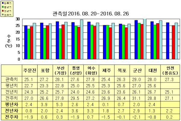 ◦ 금주(2016.09.04~2016.09.10)의 한반도 연안 표면수온은 동해 연안역에서 섭씨 22.5~25.0도, 남해 연안역에서 24.5~27.0도, 서해 연안역에서 24.5~26.0도 내외로 예상됩니다. ◦ 평년에 비해 동해 연안역은 0.5~2.0도 높게, 남해 연안역은 0.5~2.5도 높게, 목포 비슷함을 제외한 서해 연안역은 0.5~1.5도 높게 나타날 것으로 예상됩니다. ◦전년에 비해 동해 연안역은 0.5~2.0도 높게, 남해 연안역은 1.5~3.0도 높게, 서해 연안역은 0.5~2.0도 높게 나타날 것으로 예상됩니다. |