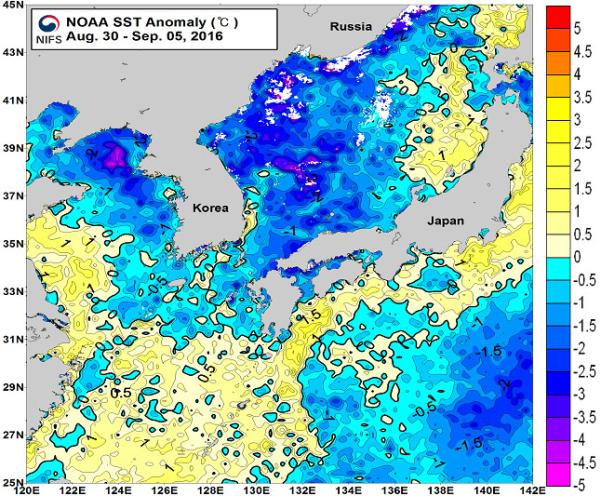 ◦「평년에 비해」 대화퇴 근해 1도 낮게, 울릉도-독도 근해 0.5도 낮게, 대마도 근해 비슷하게, 제주도 근해 0.5도 낮게, 이어도 근해 0.5도 낮게, 가거초 근해 0.5도 낮게, 어청도 근해 1도 낮게 나타날 것으로 예상됩니다. NOAA 위성영상 표면수온 평년편차 분포도 (2016. 08. 30 ~ 2016. 09. 02)