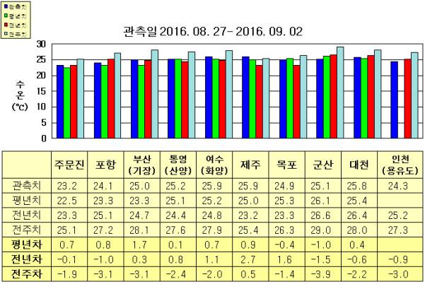 ◦ 금주(2016.09.11~2016.09.17)의 한반도 연안 표면수온은 동해 연안역에서 섭씨 21.5~24.0도, 남해 연안역에서 23.5~26.0도, 서해 연안역에서 23.5~25.5도 내외로 예상됩니다. ◦ 평년에 비해 포항 비슷함을 제외한 동해 연안역은 0.5~1.0도 높게, 통영 비슷함을 제외한 남해 연안역은 1.0~1.5도 높게, 목포 비슷함을 제외한 서해 연안역은 0.5~2.0도 높게 나타날 것으로 예상됩니다. ◦전년에 비해 부산(기장) 0.9도 높음을 제외한 동해 연안역은 비슷하게, 남해 연안역은 0.5~2.0도 높게, 서해 연안역은 0.5~2.5도 높게 나타날 것으로 예상됩니다. |