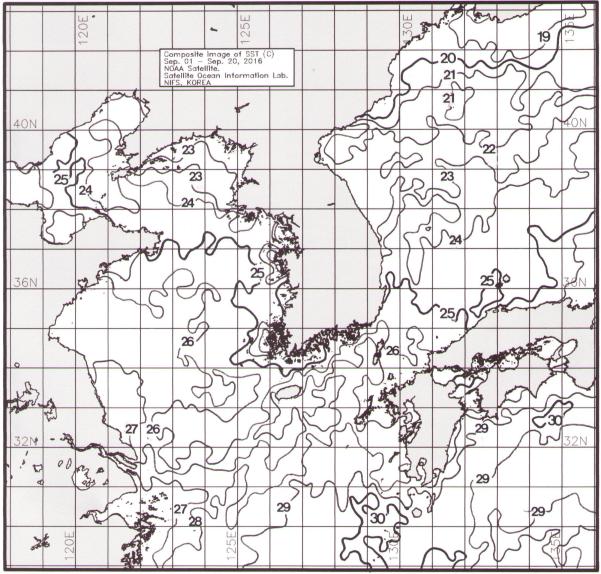 1. 9월의 근해수온분포 연안정지관측에 의한 연안수온은 월평균 22.0~26.0°C 범위의 분포를 보였다. 동해연안의 주문진, 포항의 월평균 수온은 22.0~23.8℃로서, 평년에 비해0.3~1.0°C의 고온현상을 보였다. 남해연안의 부산, 통영, 여수의 월평균 수온은 24.9~25.5°C로서, 평년에 비해 0.6~2.0°C의 고온현상을 보였고, 제주도의 수온은 22.5°C로서, 평년에 비해 1.9°C의 저온현상을 보였다. 서해연안의 군산, 인천의 월평균 수온은 24.0~26.0°C로서 평년에 비해 0.1~1.6°C의 고온현상을 보였고, 목포의 수온은 23.9°C로서 평년에 비해 0.3°C의 저온현상을 보였다. 인공위성 관측 자료로 2016년 9월 1일부터 20일까지 합성한 우리나라 주변해역 표면수온분포도를 보면(그림 1), 동해 연근해역은 23~25°C로 평년(23~26℃)에 비해 1℃ 내외의 높은 수온분포를 보였고, 대화퇴 근해는 20~21°C, 울릉도 연근해는 23~24°C의 분포를 보였다. 서해 연근해역은 22~26°C로 평년(24~27℃)에 비해 1℃ 내외의 높은 수온분포를 보였고, 어청도 연근해는 24~25°C의 분포를 보였다. 남해 연근해역은 23~27°C로 평년(23~26℃)에 비해 1℃ 내외의 높은 수온분포를 보였고, 대마도 연근해는 24~26°C, 제주도 연근해는 25~27°C의 분포를 보였다. 2. 10월 예측 10월의 연안 월평균 수온은 동해가 17~23℃로 평년보다 1℃ 내외의 높은 수온 분포를 보이고, 남해가 19~24℃로 평년보다 1℃ 내외의 높은 수온분포를 보이겠으며, 서해는 18~23℃로 평년보다 1℃ 내외의 높은 수온분포를 보일 것으로 전망된다. 그림 1. 2016년 9월 1~20일까지 합성한 위성관측 표면수온분포도. |