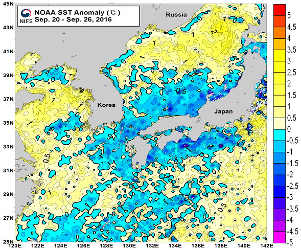 광역 위성영상 합성 표면수온 분포도 (2016. 09. 20 ~ 2016. 09. 26) ◦「평년에 비해」 대화퇴 근해 1도 높게, 울릉도-독도 근해 0.5도 높게, 대마도 근해 0.5도 낮게, 제주도 근해 비슷하게, 이어도 근해 0.5도 높게, 가거초 근해 0.5도 높게, 어청도 근해 1도 높게 나타날 것으로 예상됩니다. NOAA 위성영상 표면수온 평년편차 분포도 (2016. 09. 20 ~ 2016. 09. 26)