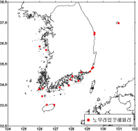 그림. 2010년 12월 3 ~ 12월 9일 한국 연안역 해파리 분포도. 해파리 모니터링요원으로부터 취합된 자료임.