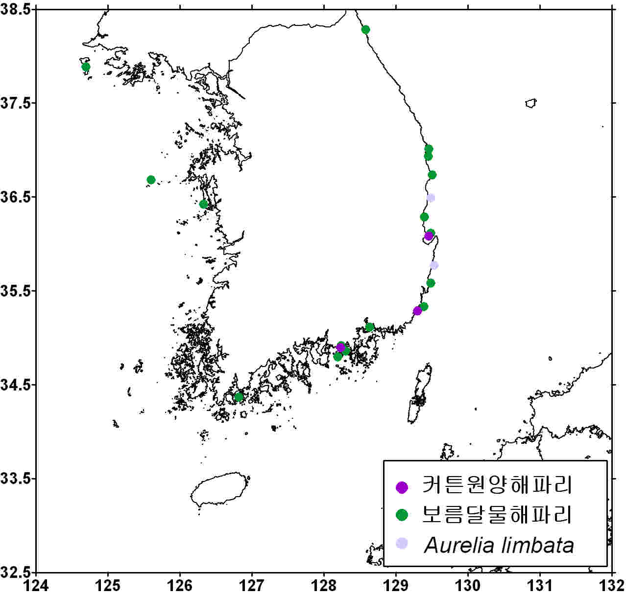 <주요상황> ☞ 커튼원양해파리 : 동•남해 일부해역 소량출현. ☞ 보름달물해파리 : 동•서•남해 일부해역 소량출현. ☞ Aurelia limbata : 동해 일부해역 소량출현. □ 해파리 출현종 및 분포상황 ○ 커튼원양해파리 - 경남/부산/경북 일부해역 1개체 내외의 소량출현. - 주간별 변동: 5/6(1.51%) ○ 보름달물해파리(무독성) - 동/서/남 일부해역에서 1∼2개체 소량출현. - 주간별 변동: 5/6(10.93%) ○ Aurelia limbata해파리(무독성) - 울산/경북 일부해역에서 1개체 내외의 소량출현. - 주간별 변동: 5/6(0.98%) ※ 주간별 변동률은 주간별 “해파리 출현/전체 응답자”를 백분율화한 것임 □ 조치사항 ○ 보름달물해파리는 및 노무라입깃해파리의 출현감시 필요 ○ 커튼원양해파리는 맹독성으로 피부접촉 주의요망 □ 금후전망 ○ 보름달물해파리가 전국연안에서 지속적으로 출현 증가