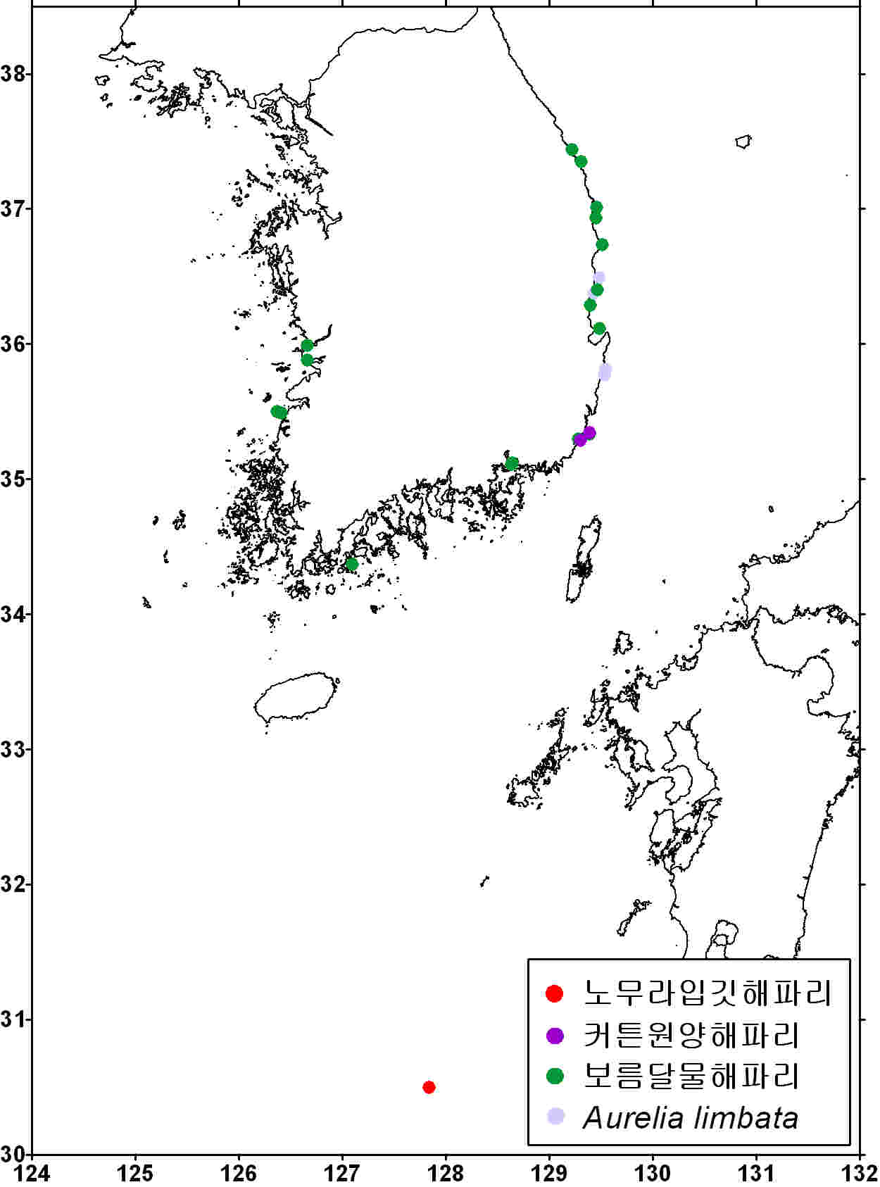 <주요상황> ☞ 노무라입깃해파리 : 동중국해 일부해역 출현 ☞ 커튼원양해파리 : 남해 일부해역 소량출현. ☞ 보름달물해파리 : 동·서·남해 일부해역 소량출현. ☞ Aurelia limbata : 동해 일부해역 소량출현.