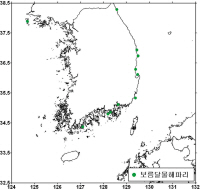 그림. 2011년 5월 14 ~ 5월 19일 한국 연안역 해파리 분포도. 해파리 모니터링요원으로부터 취합된 자료임.