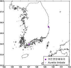 그림. 2011년 5월 27 ~ 6월 2일 한국 연안역 해파리 분포도, 해파리 모니터링요원으로부터 취합된 자료임.