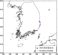 그림. 2011년 6월 17 ~ 6월 23일 한국 연안역 해파리 분포도. 해파리 모니터링요원으로부터 취합된 자료임.