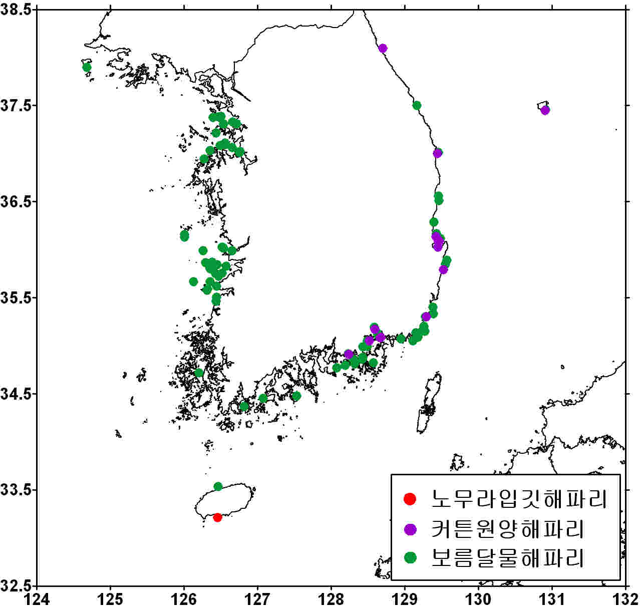 해파리 모니터링 주간보고(2011년 6월30일) - 6월24~6월30일 어업인 및 지자체 해파리모니터링요원으로부터 취합/분석된 자료임 - (국립수산과학원 해파리대책반) <주요상황> ☞ 노무라입깃해파리 : 제주도 일부해역 소량출현. ☞ 커튼원양해파리 : 동/남해 일부해역 소량출현. ☞ 보름달물해파리 : 동/서/남해 일부해역 밀집 대량출현. □ 해파리 출현종 및 분포상황 ○ 노무라입깃해파리 - 제주도 서귀포 근해 1개체 출현. - 주간별 변동: 6/16(0%) → 6/23(0.62%) → 6/30(0.54%) ○ 커튼원양해파리 - 경남/부산/경북/강원도 일부해역 2~10개체 소량출현 - 주간별 변동: 6/16(4.6%) → 6/23(5.5%) → 6/30(7.5%) ○ 보름달물해파리(저독성) - 동/서/남/제주도 일부해역에서 소량출현. 시화호 및 새만금외해, 전남 남해 일부해역 밀집출현. - 주간별 변동: 6/16(34.3%) → 6/23(38.1%) → 6/30(43.8%) ※ 주간별 변동률은 주별 “해파리 출현/전체 응답자”를 백분율화한 값으로 대량출현의 판단근거로는 이용될 수 없음 □ 조치사항 ○ 보름달물해파리가 서·남해 일부지역에서 밀집 출현하므로 조업시 주의 요망 ○ 노무라입깃해파리의 지속적인 집중감시 필요 ○ 노무라입깃해파리와 커튼원양해파리는 맹독성으로 피부접촉 주의요망 □ 금후전망 ○ 보름달물해파리가 전국연안에서 지속적으로 출현 증가 ○ 노무라입깃해파리의가 연근해역에서 출현증가 출현 해파리 분포도