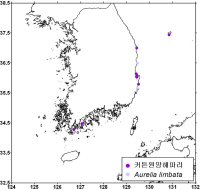 그림. 2011년 6월 24 ~ 6월 30일 한국 연안역 해파리 분포도. 해파리 모니터링요원으로부터 취합된 자료임.