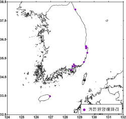 그림. 2011년 7월 1 ~ 7월 7일 한국 연안역 해파리 분포도. 해파리 모니터링요원 및 지자체로부터 취합된 자료임.