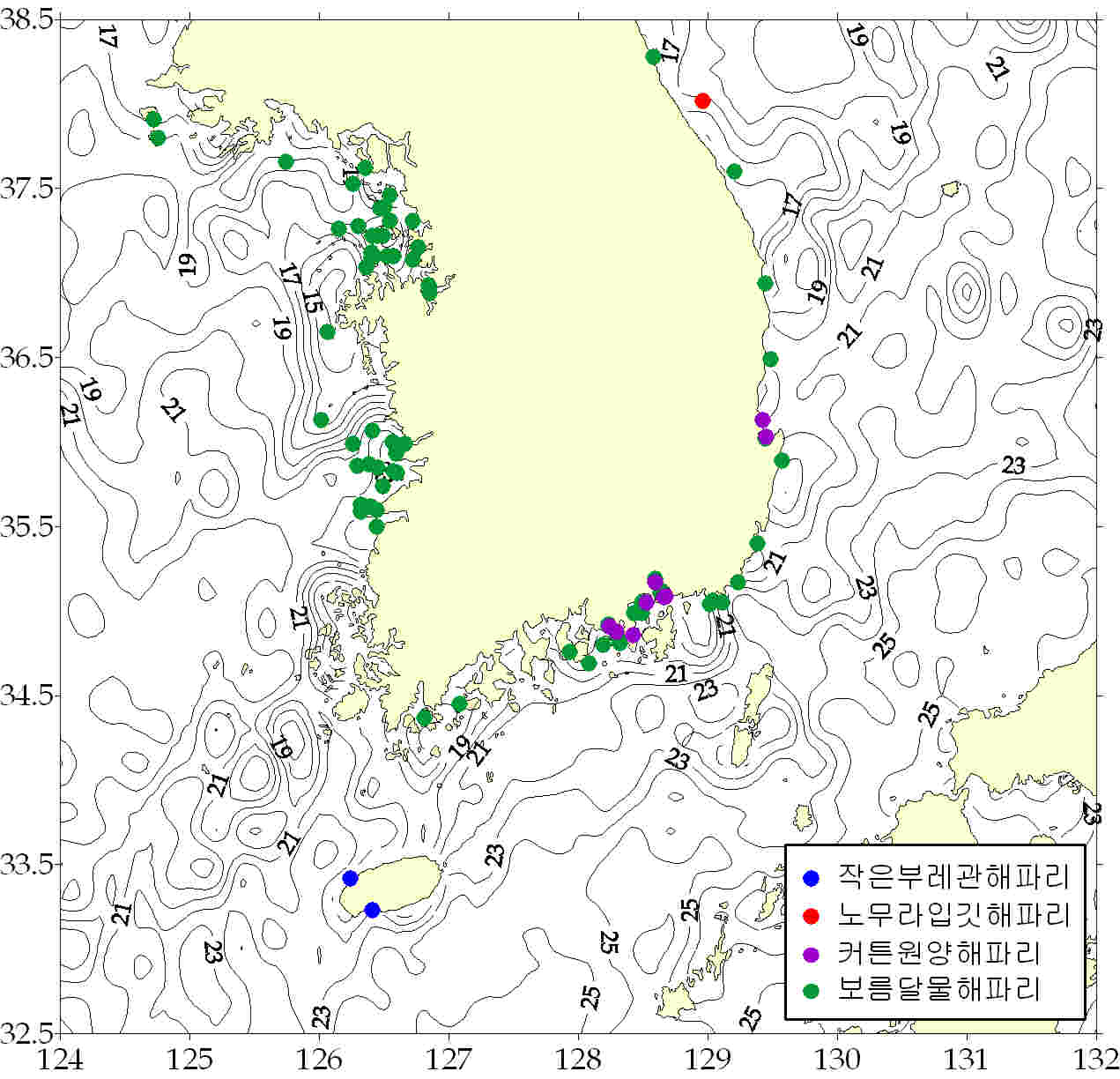 그림. 2011년 7월 15 ~ 7월 21일 한국 연안역 해파리 분포도. 해파리 모니터링요원 및 지자체로부터 취합된 자료임. 등온선은 위성관측 표층수온을 가리킴.