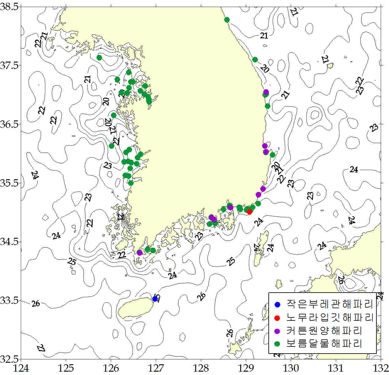 그림. 2011년 7월 22 ~ 7월 28일 한국 연안역 해파리 분포도. 해파리모니터링요원 및 지자체로부터 취합된 자료임. 등온선은 위성광측 표층수오을 가리킴.