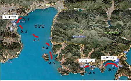 그림. 남해 앵강만 주변 7개 조사정점 표1.