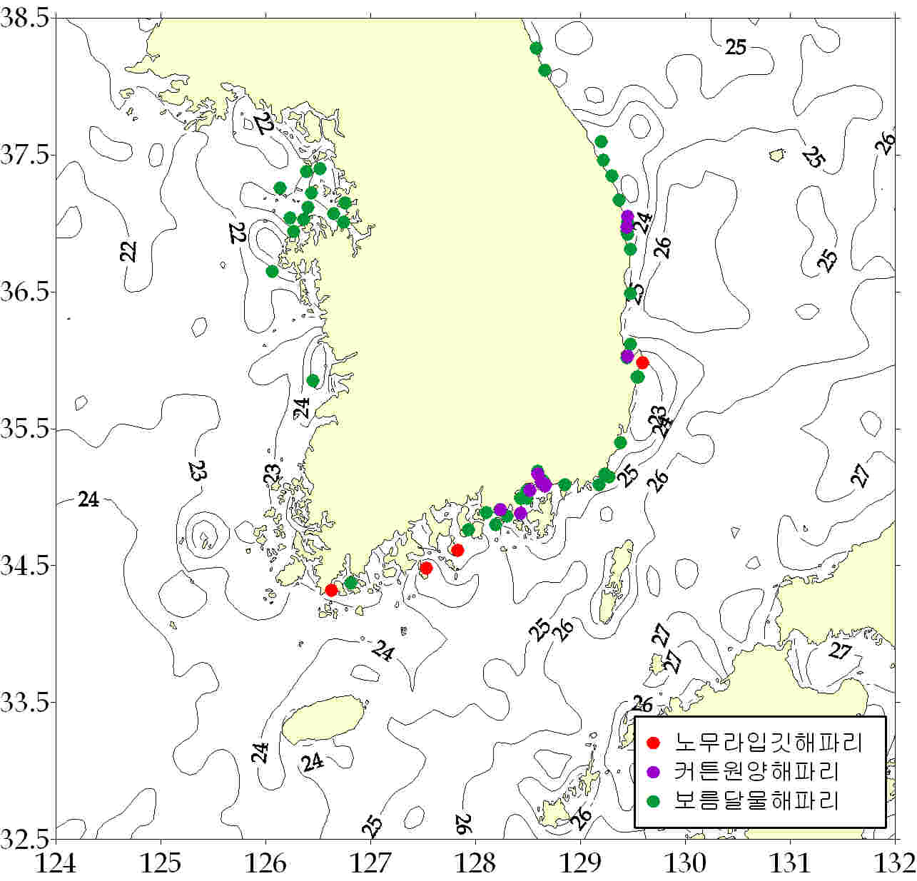 그림. 2011년 8월 12 ~ 8월 18일 한국 연안역 해파리 분포도. 해파리 모니터링요원 및 지자체로부터 취합된 자료임. 등온선은 위성관측 표층수온을 가리킴.