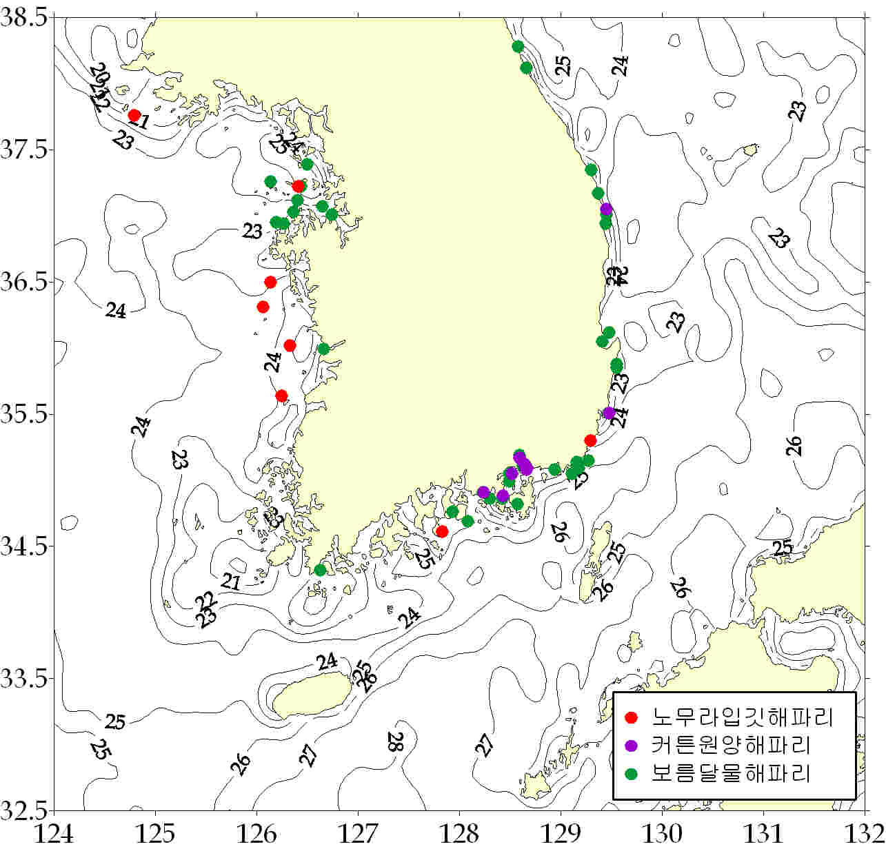 그림. 2011년 9월 2일 ~ 9월 8일 한국 연안역 해파리 분포도. 해파리 모니터링요원및 지차체로부터 취합된 자료임. 등온선은 위성관측 표층수온을 가리킴.